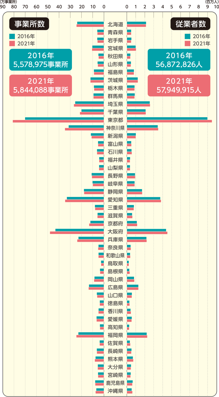 経済センサス-活動調査とは、全国すべての事業所・企業を対象とした、経済活動の実態を網羅的に明らかにする日本唯一の統計調査で、例えると「経済の国勢調査」とも言える調査です。