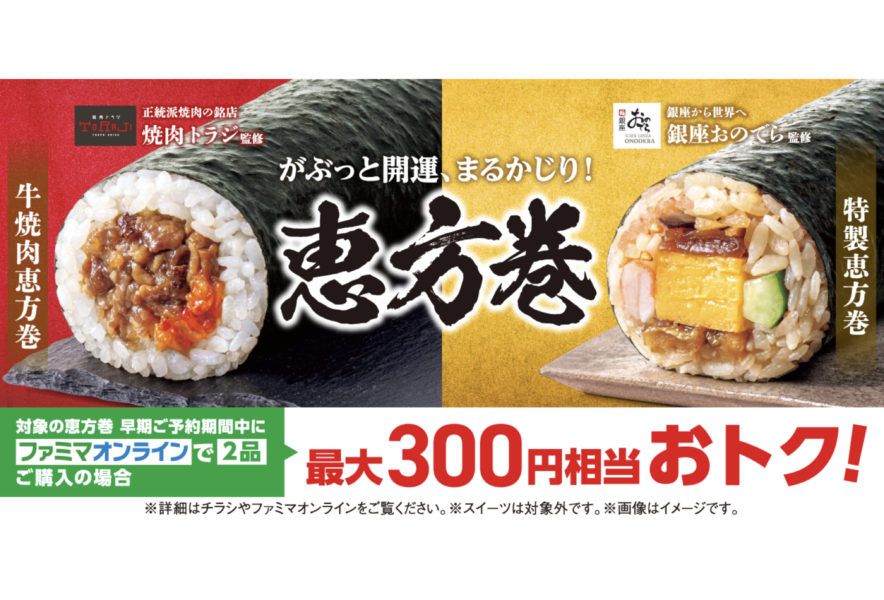 株式会社ファミリーマートは、継続して取り組んでいる5つのキーワードのうち「もっと美味しく」「あなたのうれしい」の一環で、2026年の恵方巻の予約を2025年12月19日から、全国のファミリーマート約16,400店およびファミマオンラインにて開始。