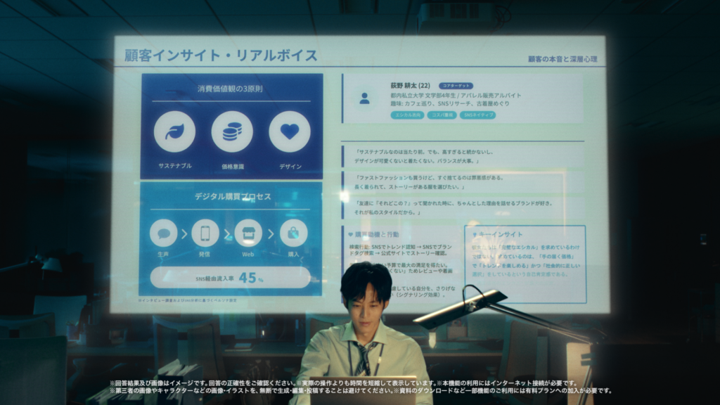 壊滅的に資料デザインのクオリティが低く商談を失敗させてしまう「資料作成ド下手マン」から、Gensparkという武器を手に「資料作成素敵マン」へと華麗な変貌を遂げる男を演じています。