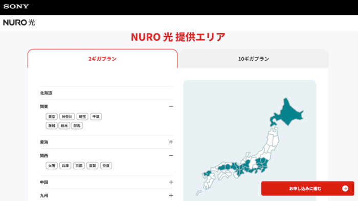 対応エリアについては、2ギガプラン・10ギガプランともに北海道、関東、東海、関西、中国、九州といった広い地域で利用可能。