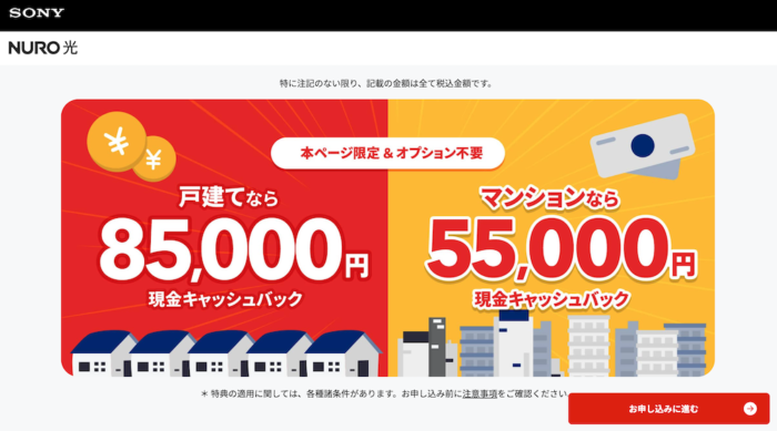 NURO光では、新規契約者向けに実施している最大85,000円のキャッシュバックが特に注目されているキャンペーンの一つ。