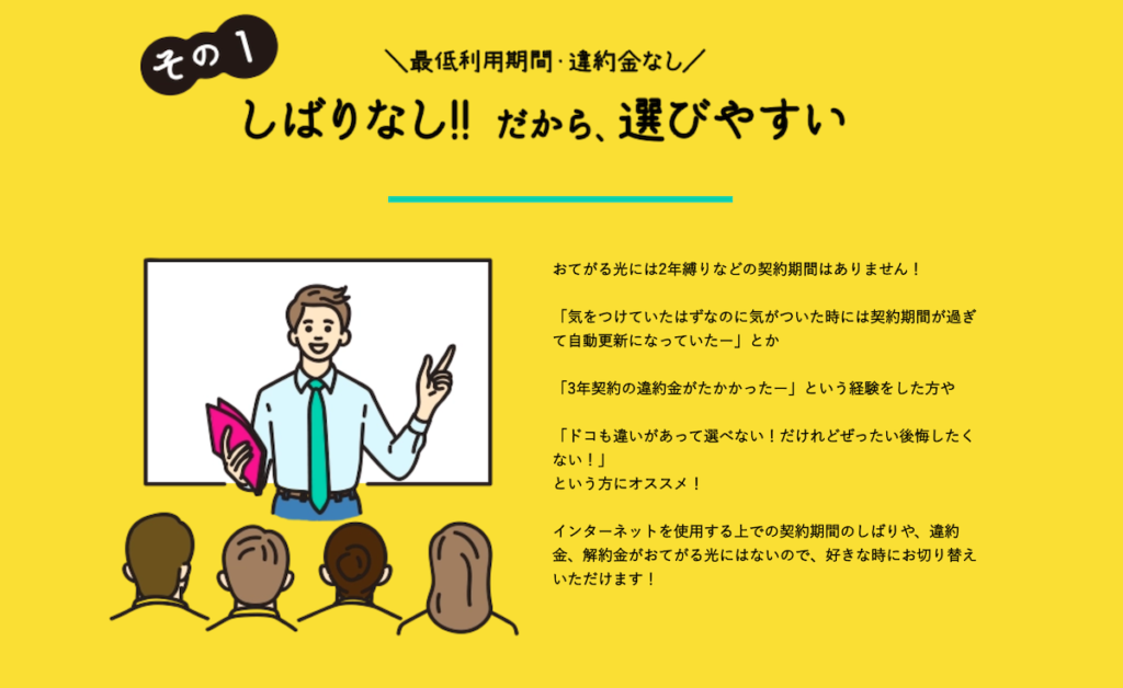 従来の光回線では数年単位の契約が一般的で、途中で解約すると高額な違約金が発生するケースも少なくありませんでしたが、おてがる光ならその心配がなく、引っ越しやライフスタイルの変化を気にせず利用できると評価されています。