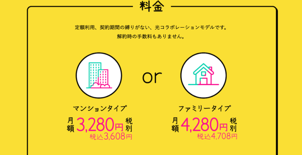 基本的な月額料金は、戸建て(ファミリー)タイプで4,708円(税込)、マンションタイプで3,608円(税込)となっており、契約期間の縛りがないにもかかわらず料金体系が明瞭である点が魅力。
