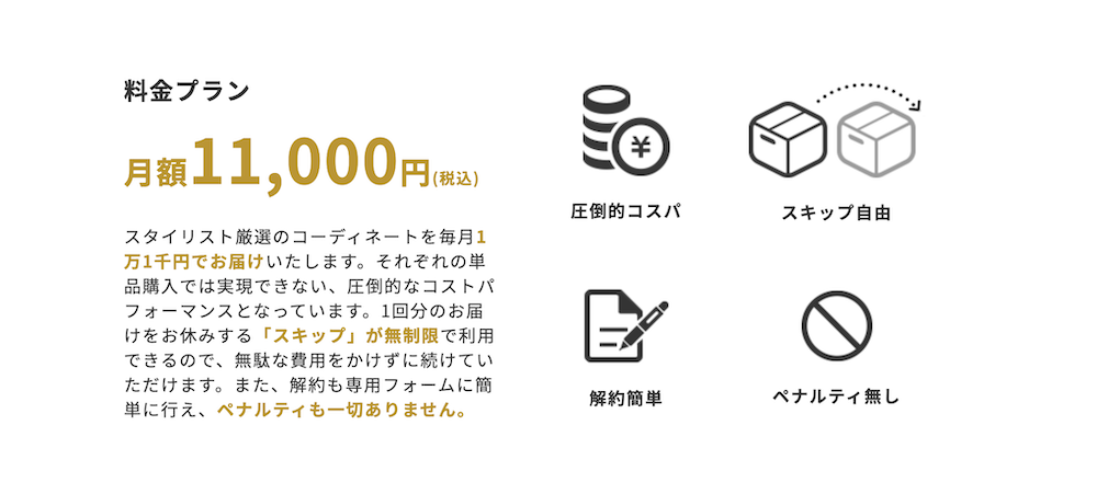 月額11,000円(税込)という価格には、スタイリストの選定料やサービス維持費も含まれています。