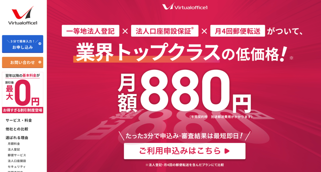 バーチャルオフィス1は、東京(渋谷・千代田)を中心にバーチャルオフィスサービスを提供している事業者で、法人登記や住所利用、郵便物転送などを低価格で利用可能なサービス。
