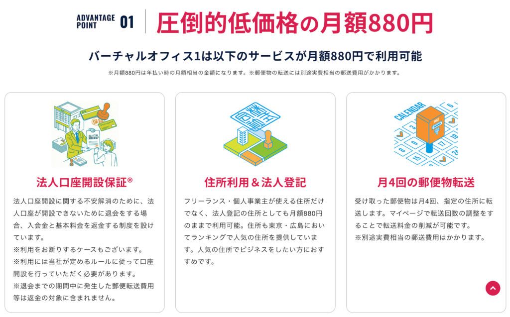 特に渋谷や千代田区の住所が、月額880円(税込)+郵送費用で利用できるという価格設定は、他のバーチャルオフィスと比較しても“低コスト”な部類。