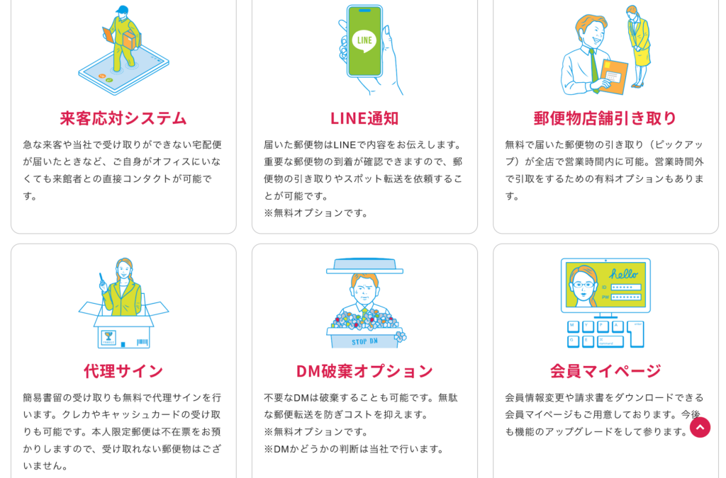 郵便物の到着についてはLINE通知で知らせてもらえる仕組みが提供されており、不要なDMについては廃棄してもらえるため、無駄な郵送コストや手間を削減できる点も魅力。