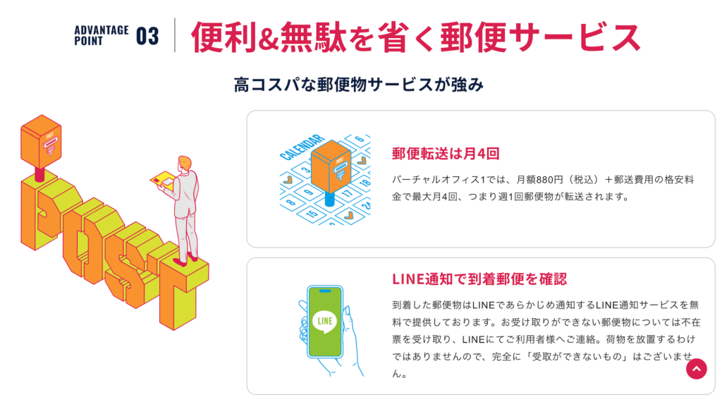では、郵便物の管理サービスも基本プランに含まれており、月4回までの郵便転送に対応しています。