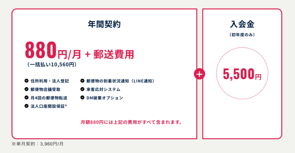 特に料金面は起業フェーズの利用者から注目されており、年間契約の場合は月額880円(税込)+郵送費用で利用できます。